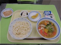 《献立》*ほうとう風うどん*白玉団子黒蜜きな粉かけ*スイートスプリング*牛乳《食...