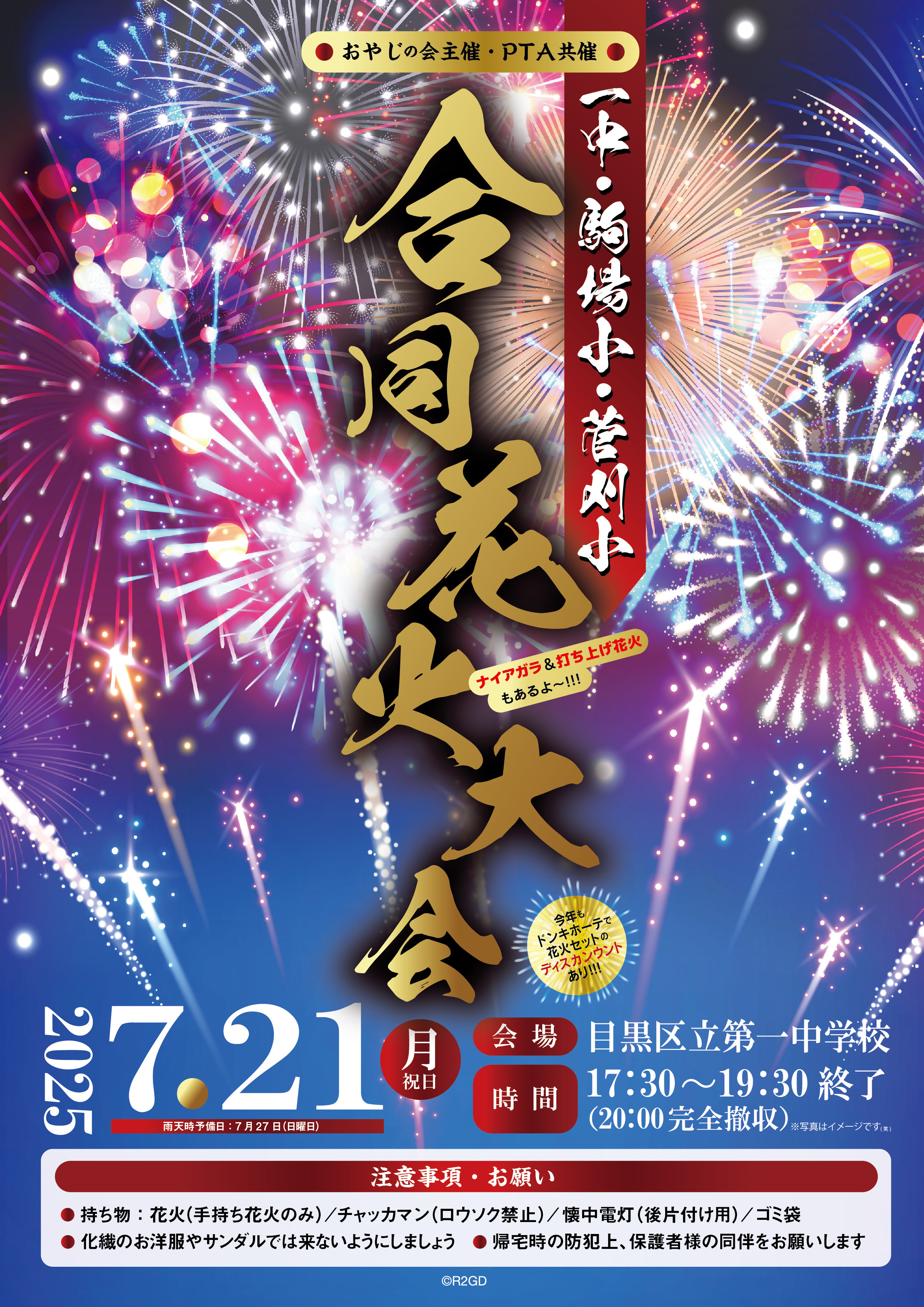 7月21日(祝・月)17:30~19:30、一中校庭にて、おやじの会主催・菅刈小学校、駒場小学校、第一中学校のPTA共催の合同花火大会を開催いたします。詳細は御案内をご覧ください。
