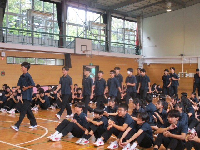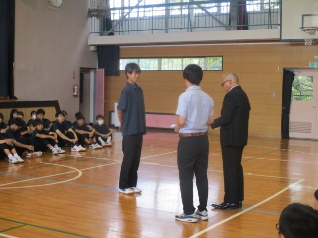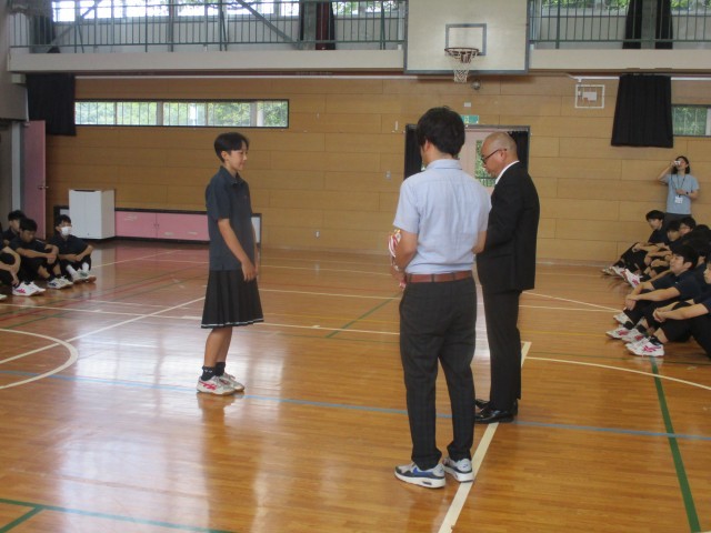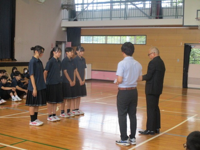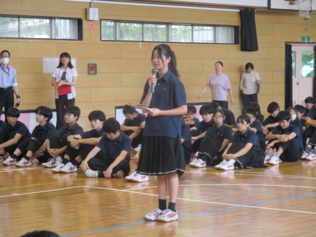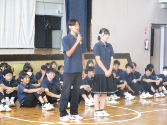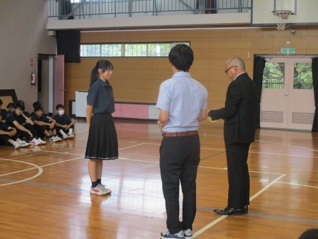 今日は区連体の報告会が行われ、入賞生徒の発表と賞状とメダル授与が行われました。応援団長からは一中の代表として勇姿を見せてくれた選手のみなさんに労いの言葉が伝えられました。そして選手代表からはみなさんの応援で最後まで頑張ることができました。ありがとうございました。」というメッセージをもらいました。「ありがとう」の感謝の気持ちが交錯し、一中が1つにまとまったことを実感できる瞬間でした。一生懸命に本気で取り組むと自分の中にずっと残るものがあり、それが成長の糧となります。最後の区連体を終えた3年生の思いを引き継ぎ、来年度の区連体もそれぞれの場所で精一杯頑張りましょう。
