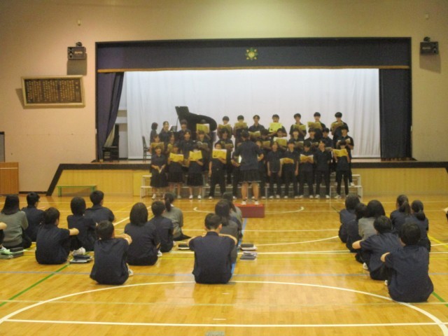 1年生と3年生の合同合唱練習をしました。3年生の迫力のある合唱をお手本に、1年生も初めての合唱コンクールに向けて練習を頑張っています。
