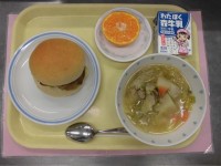 今日の献立は『スパゲティ地中海ソース オニオンドレッシングサラダ スイートポテトケーキ 牛乳』でした。