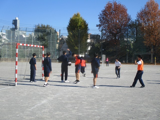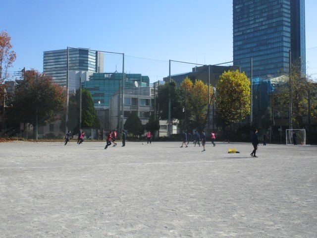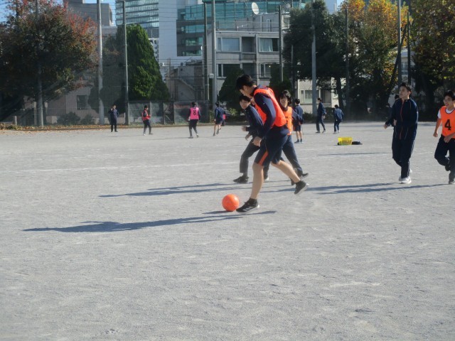 青空の下、広い校庭では3年生男子がサッカーの授業を行っています。チーム対抗戦の試合では、みんな元気にボールを追いかけています。