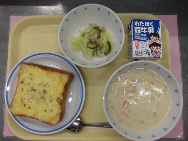 今日の献立は『エッグトースト コーンシチュー グリーンサラダ 牛乳』でした。