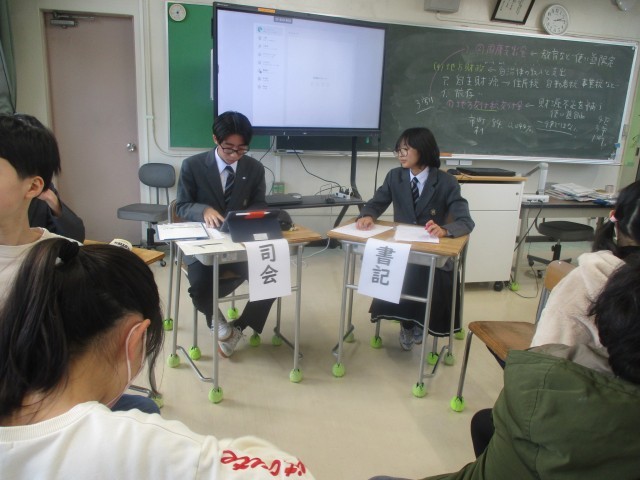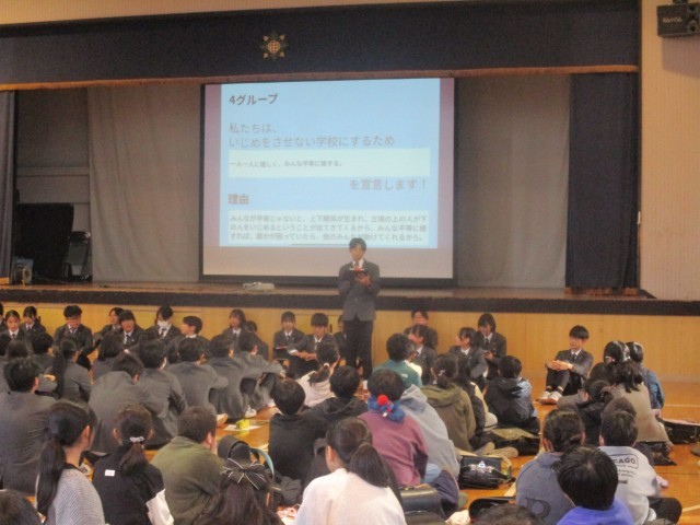 今日は、第一中学校の2年生、駒場小学校と菅刈小学校の6年生によるいじめ問題を考えるめぐろ子ども会議が行われました。「いじめに気付ける学校をめざして~相手の表情などを見て行動するために~」というテーマで、小中合同の小グループで話合い、「いじめをさせない学校作りの行動宣言を考えました。今日の会議で考えたことや気付いたことを学校全体に広げていきましょう。たくさんの地域の皆様、保護者の皆様にもご来校いただきました。ご家庭でも話題にしていただけたら幸いです。