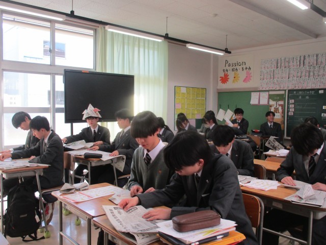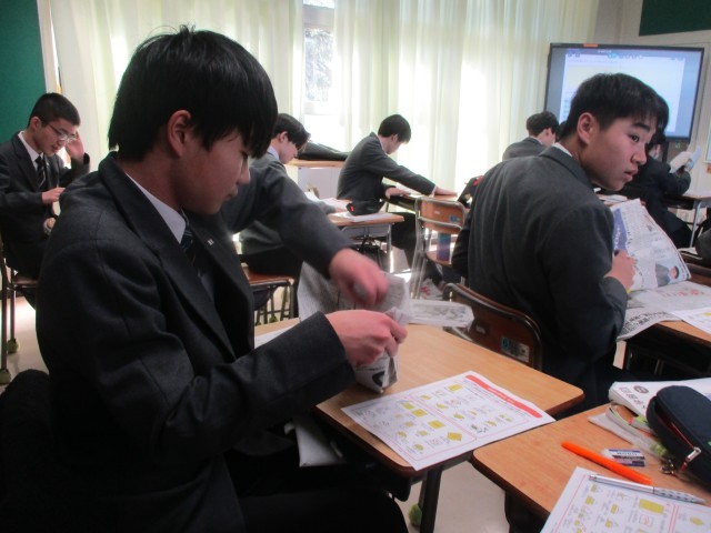 授業の後半では、新聞紙をつかって紙食器やスリッパを作りました。覚えておくと、役立ちますね。