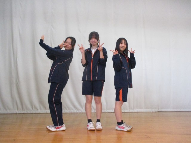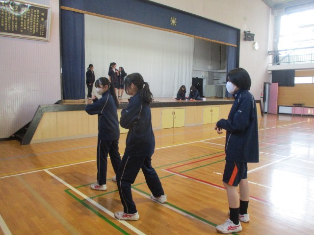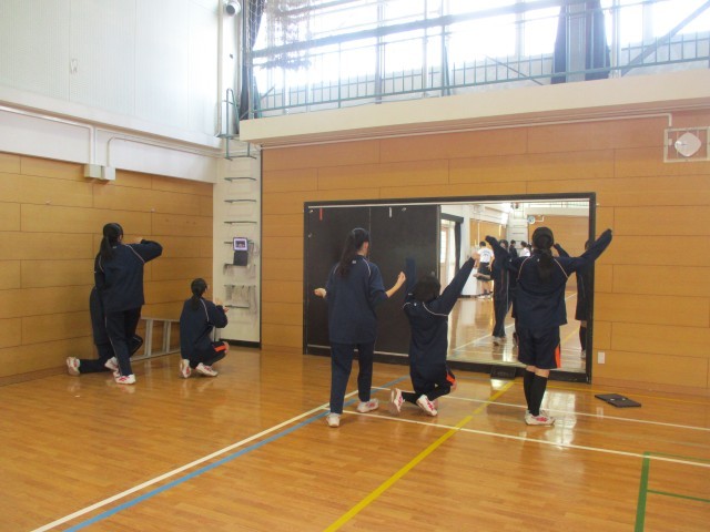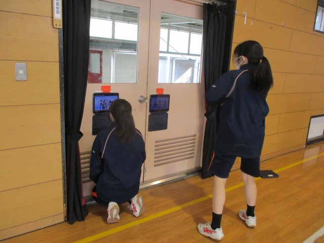 ダンスの授業です。学習用端末を活用して、グループごとに練習しています。