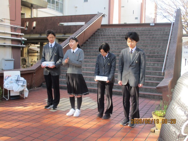 第3学年委員会は、1年生のときから毎週火曜と木曜にあいさつ運動を行っています。小さなあいさつ運動が地域に広がり、今年度はPTAの方々、地域の方々と一中の教職員全員による月1回のあいさつ運動も始まりました。今日は、地域の一中スマイル応援団の皆さんから3年生に卒業記念の手作りキーホルダーとメッセージカードをプレゼントしていただきました。3年生代表の4人の生徒が受け取り、お礼の言葉を伝えました。3年間生徒を見守ってくださった地域の皆様と生徒の交流に心が温かくなりました。