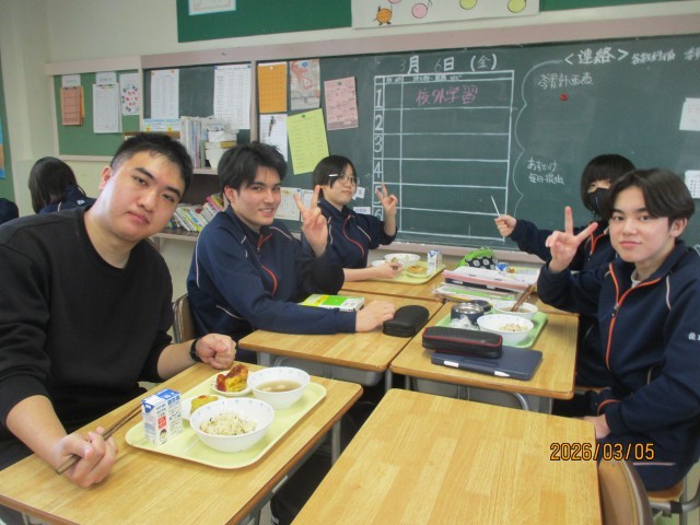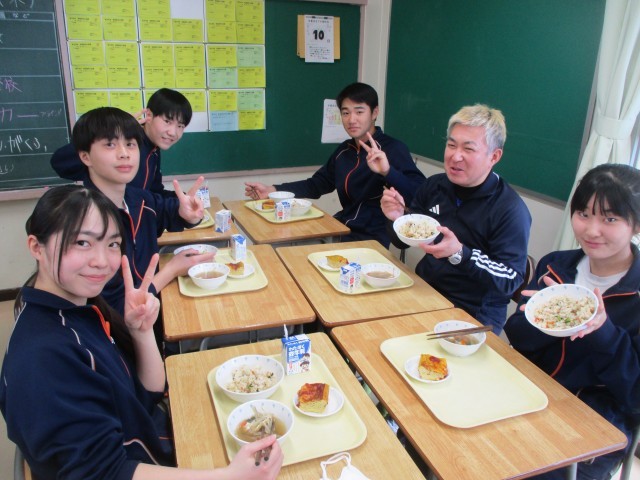 講師の高橋さんと駒崎選手と交流給食を実施しました。ブラインドサッカー®を通してすっかり打ち解けた3年生は、いろいろな話をしながら会食を楽しんでいました。話が尽きず、休み時間もおしゃべりをしたり、一緒に歌を歌ったりして過ごしました。