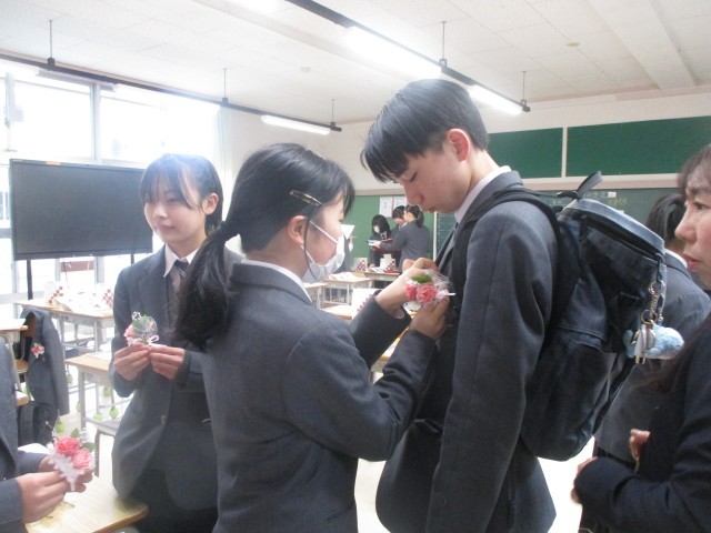 在校生に胸花をつけてもらっています。