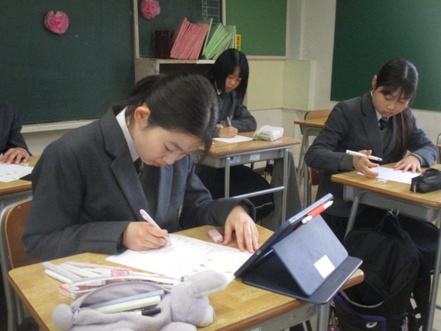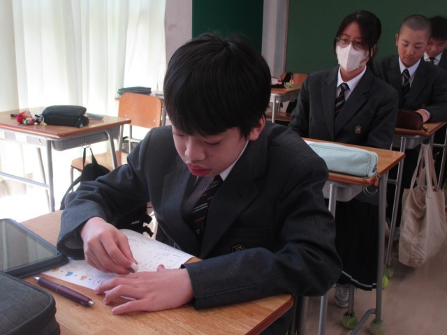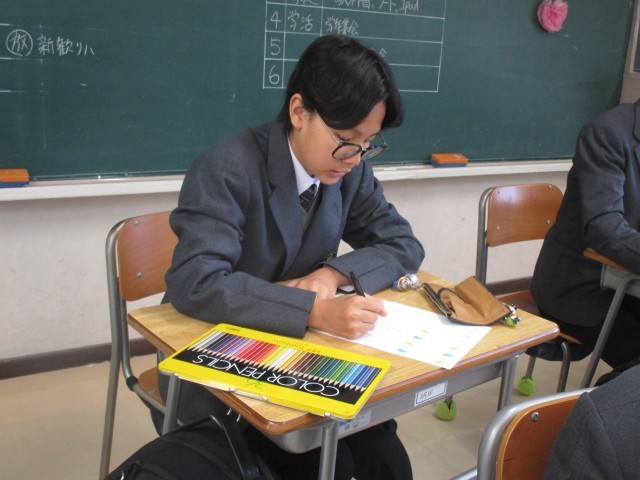 自己紹介カードの作成をしています。新しいクラスの仲間に自分のことを知ってもらうために、好きなことや得意なこと、頑張りたいことなどをていねいに書いています。