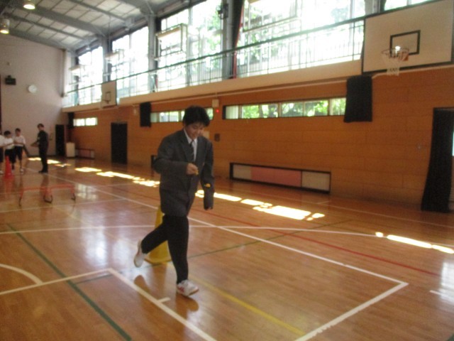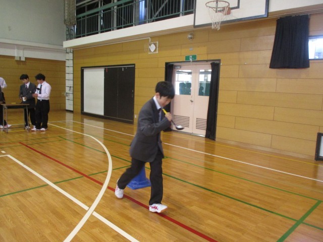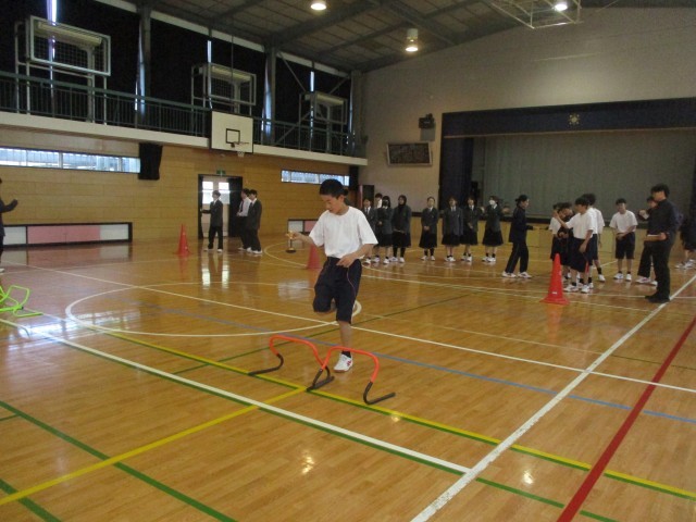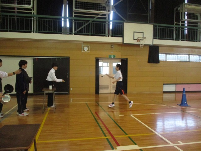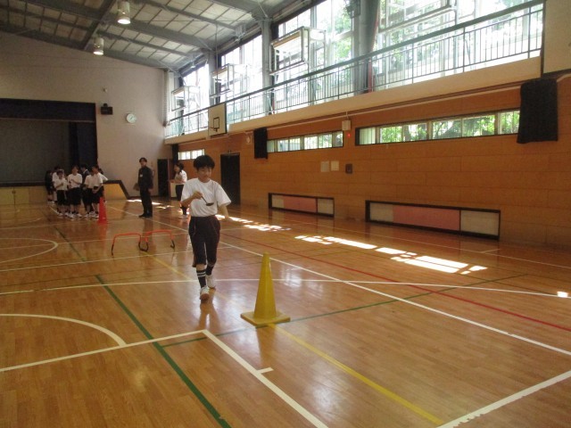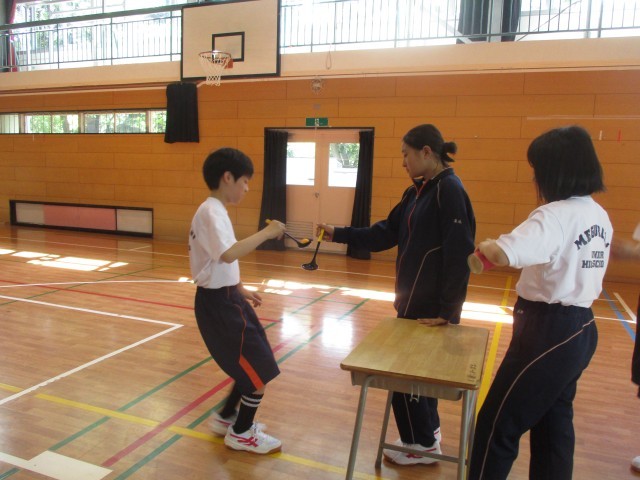お昼休みの体育館で、1年生が運動会種目「おたまでポン!」の体験をしました。ミニハードルを飛び越えたり、カラーコーンを回ったりしながら卓球の球をおたまで運び、次の走者に渡すという競技です。和気あいあいと楽しい時間を過ごしました。