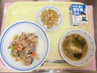 じゃこ入りわかめご飯 ジャンボ餃子 白菜の即席漬け すまし汁 牛乳