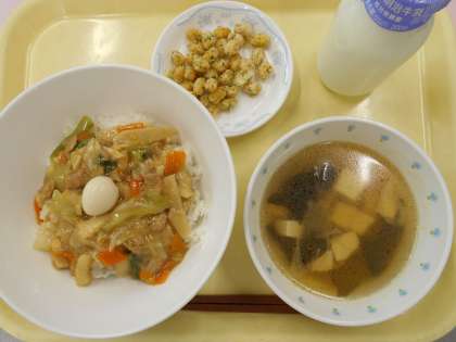 中華丼には、豚肉、いか、えび、うずら卵、野菜が6種、全部で10種類の食材が入っています。色々な食品を食べると、栄養のバランスが良くなります。