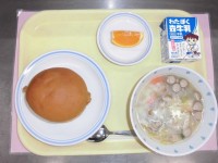 今日の主食は「カレーライス」です。1年生は給食で食べる最初のカレーライスになります。小学校のカレーと辛さが違うのではないかと思います。給食のカレーは、玉葱をじっくり炒め、ルウも小麦粉から炒めて作ることが、おいしさの秘訣です。調理員さんが、釜の前でじっくり炒めて、煮込んでくださる特製のカレーです。