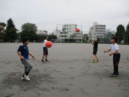 校庭ではサッカー部が、基礎練習やキック練習を練習しています。一中の校庭はとても広いので、野球部、サッカー部、テニス部が同時に思いっきり運動することができます。