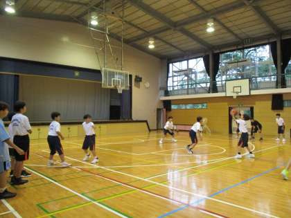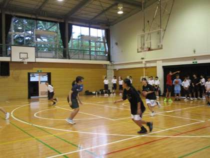 体育館では男女バスケットボール部が練習していました。基礎練習から実戦練習まで、一生懸命取り組んでいます。