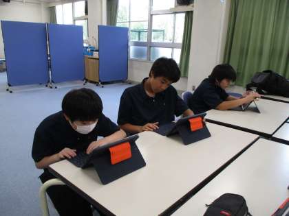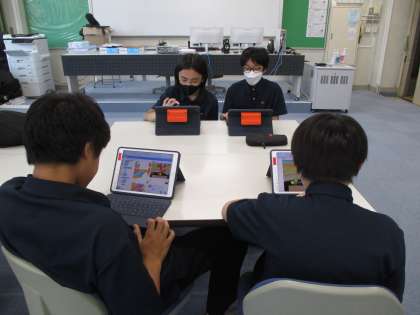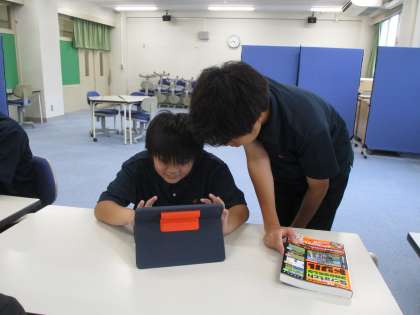 プログラミングでオリジナルのゲームを作っていました。専門書をもった3年生が1年生にやさしく教えていました。