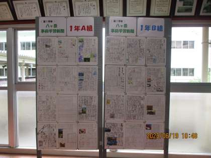 2階の一中プラザに1年生の八ヶ岳事前学習新聞が展示されています。