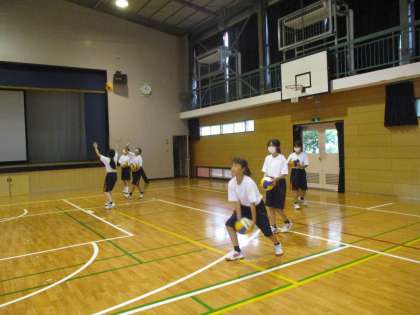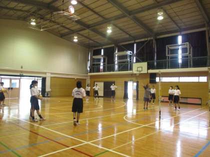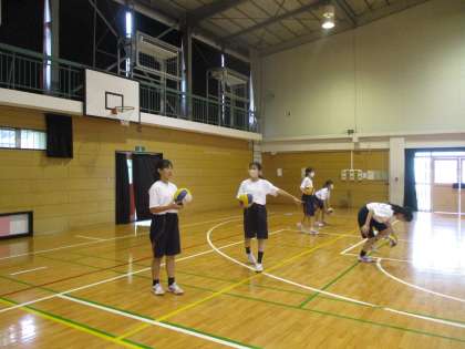 1年生の女子は、体育館でバレーボールの練習をしていました。ネットをはさんでの初めての対人プレーでしたが、先生のアドバイスをよく聞いて取り組んでいました。「ドンマイ!」「ナイス!」優しい声かけがたくさん聞こえてきました。