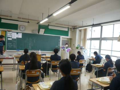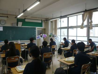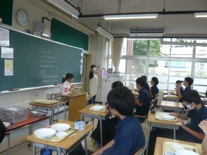 3年生が修学旅行で行った金沢市との文化交流として、金沢の食材を用いた本日の給食です。金沢の食材である「金時草」を使ったゼリーをみんなでおいしく食べました。また、香味揚げの魚は、石川県で採れた「ハタハタ」でした。給食の時間に優しい栄養士さんの教室での金時草の説明もありました。食についての教養も、おいしく深めている一中の子供達です。