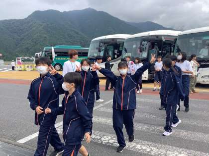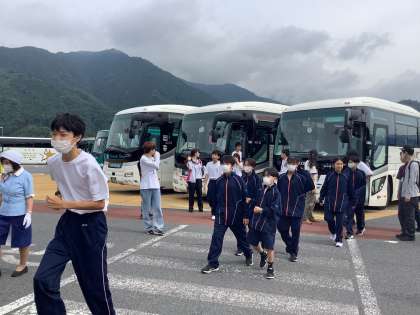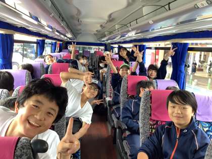 バスの中では、レク係が準備してきたイントロクイズやイラスト伝言ゲームで楽しく過ごしています。