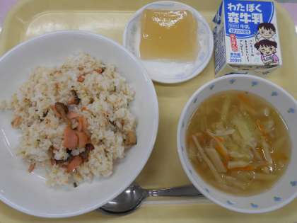 今日の主食は「鮭バターライス」でした。この時期の鮭は「秋鮭」と呼ばれていて、身が引き締まってあっさりとしているのが特徴です。鮭の身はきれいなピンク色をしているので、赤身魚の仲間と思われがちですが、白身魚の仲間です。