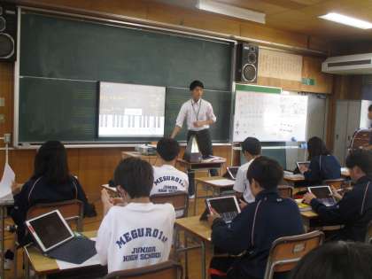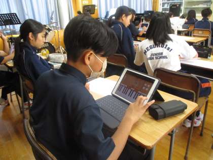 教育実習生による授業の様子です。iPadのアプリ「ガレージバンド」を使って音楽を作っています。次の授業では、班ごとに録音して完成した音楽の発表をします。