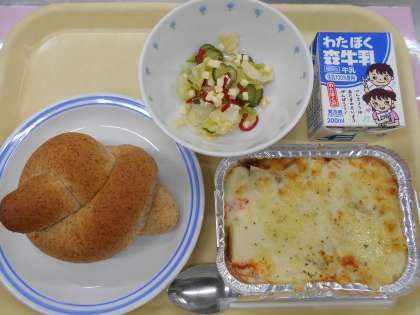 今日の主菜は「ムサカ」でした。「ムサカ」はギリシャ料理で、ナスとミートソース、ホワイトソースを重ねたグラタンに似た料理です。給食ではナス入りミートソース、じゃがいも、ホワイトソースを重ね、チーズをかけて焼きました。今日もおいしくいただきました。