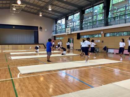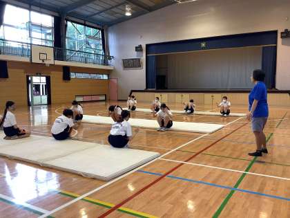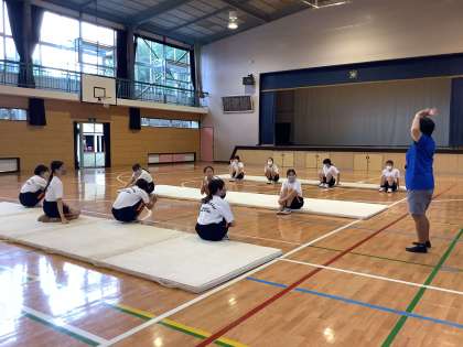 女子の体育は、マット運動です。先生の話をしっかり聞いて、安全に取り組んでいます。