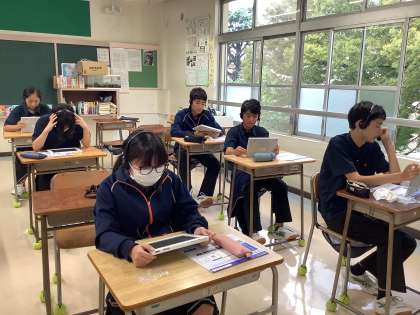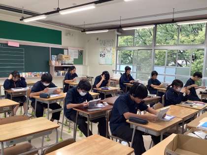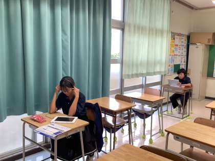 今週、2年生は、GTEC(英語4技能検定)を実施しています。テストの中にはスピーキングもあり、専用のタブレットとヘッドセットをつけて取り組みました。