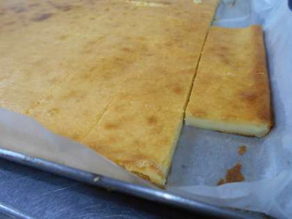 今日のデザートは「チーズケーキ」でした。「チーズケーキ」は、クリームチーズを柔らくして練り、生地を作り、給食室で焼きました。