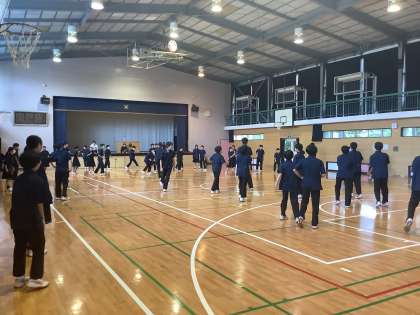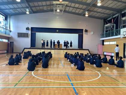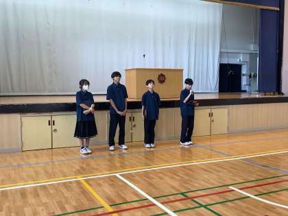 10月6日(金)、1年生の前期最後の学年集会が行われました。学年委員、先生からのお話がありました。そして、事前アンケートで選ばれたクラスと学校行事の2部門で頑張った生徒8名の表彰がありました。この日に表彰された人以外にも、アンケートにはたくさんの生徒の名前が挙がっていました。最後は、クラス対抗のミニレクで楽しい時間を過ごしました。後期も自分の力を仲間や周囲の人のために存分に発揮し、頑張っている仲間を尊重する良い1学年であってほしいと思います。