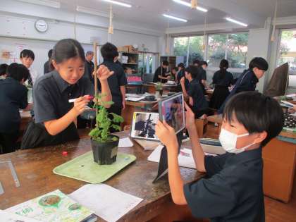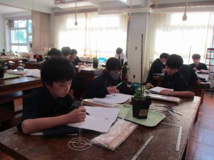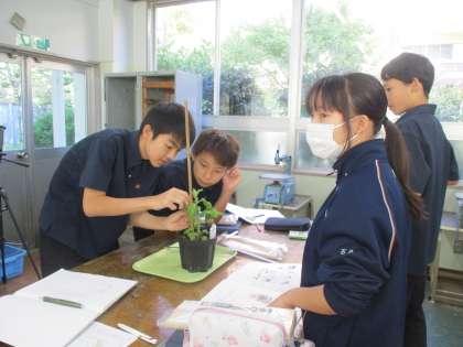 1年生は技術科の授業で「菊の栽培」をしています。今日は2週間ぶりに草の草丈と伸び率を観察しました。2cm伸びていたグループ、8cm伸びていたグループなどざまざまでした。日当たりなど、元気に育てるために必要なことを考えました。