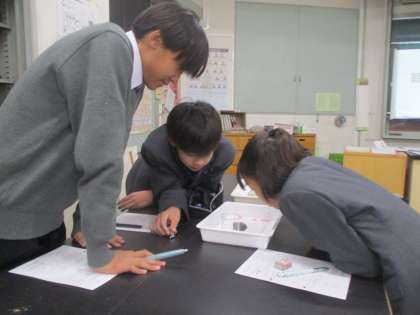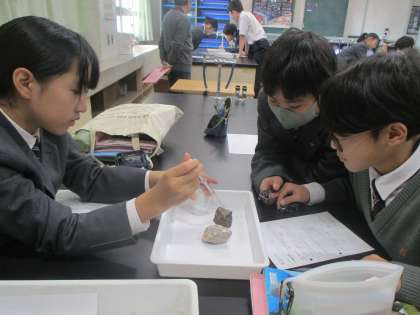 堆積岩の学習がテーマです。うすい塩酸をかけて、その反応を観察していました。1年生、真剣に学んでいます。