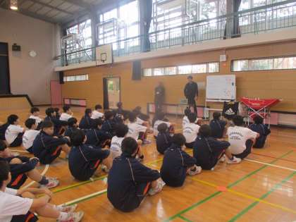 バレーボールの授業です。ゲームを通して、ボールをつなぐことが目標です。チームで声をかけ合い、協力することの大切さを学んでいます。