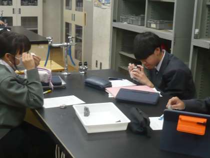 自分で鉱物の状態を観察し、友達と意見交換しながら学びを進めています。