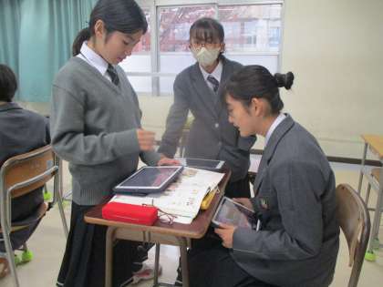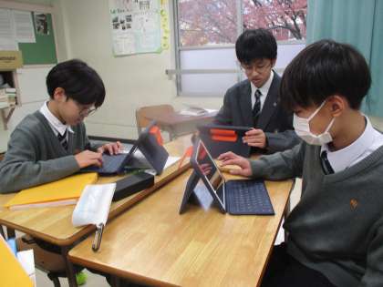 横浜校外学習を振り返り、感嘆文を交えたスキットの作成と発表をしていました。
