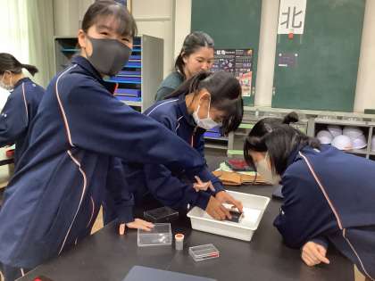 物理の授業です。鉄粉と方位磁針を使って、磁石の周りの磁界の向きを調べていました。一中生は積極的に学びます。