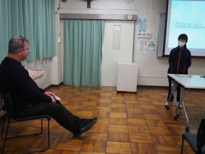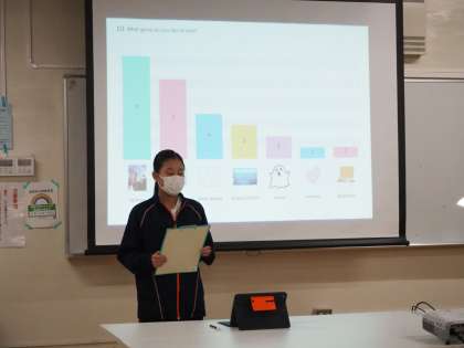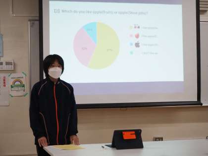 クラスで英語プレゼンテーションをしていました。一人一人がアンケートを通して特徴やポイントなどを比較し、順序立ててまとまりよく発表することができました。