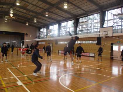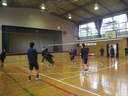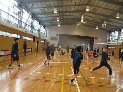 バレーボールの実技の授業です。今日はチームになって、ゲーム形式の練習に取り組んでいます。さすが2年生、スパイクも決まっています。みんなで楽しくバレーボールの授業に取り組んでいます。