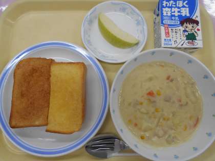 今日の主食は「シナモントースト」と「ハニートースト」でした。生徒のみなさんに違う味を楽しんでもらいたいと思い、トーストは2種類にしました。