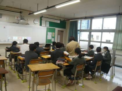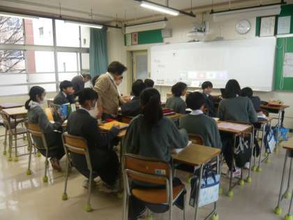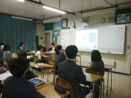 1年生の英語の授業です。先生から質問されたことを自分で考え、友達と話し合い、自分の答えを出していきます。