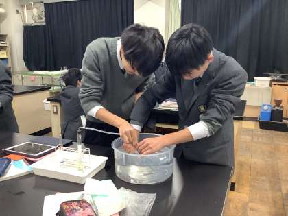 二酸化炭素の発生実験をしています。一中の理科の授業は少人数授業展開なので、2人1組で実験をすることができます。
