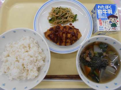 毎月19日は食育の日です。今月は青森県の郷土料理「せんべい汁」にしました。汁に入れるせんべいは「南部せんべい」といい、約200年も前から食べられているものです。