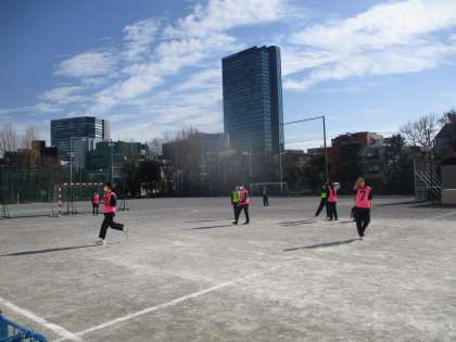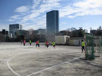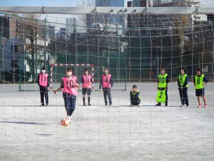 サッカーの授業です。青空の下、広い校庭で伸び伸びと体を動かしています。