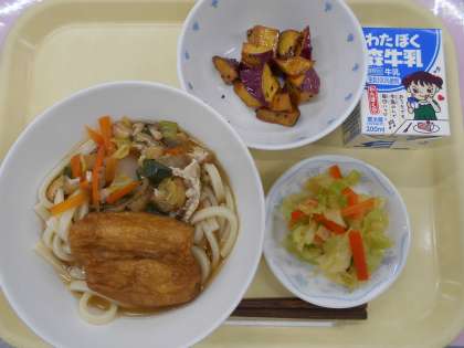 それにちなんで給食では、丸もちを油揚げに入れて味付けをした「力うどん」にしました。