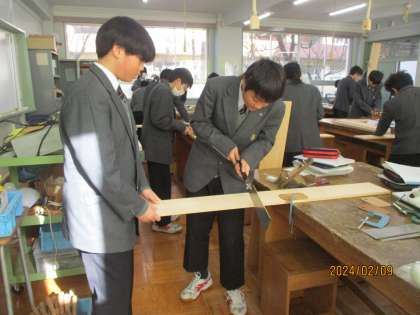 木材加工の学習をしています。今日は切断作業をするので、先生から注意点をよく聞いて、長い板を切断します。