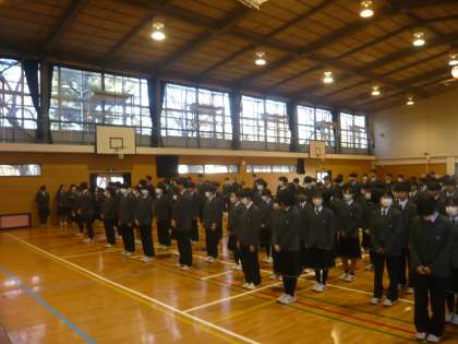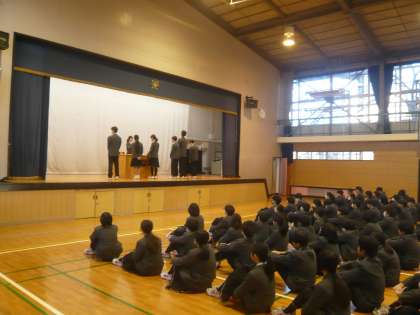 生徒会の進行、準備、調整など、意欲的に取り組む姿が素晴らしいです。また、各委員長の発表もそれぞれの委員会で話し合ったことを、わかりやすく述べています。会が始まる前から、静かで静かに整列している一中生です。そして、会が始まり、聞いている姿勢も良く、発表する生徒も、聞く生徒もお互いが支え合って、生徒会朝礼が行われています。K-1キャロットカップ(1月開催)の表彰も体育委員会が行いました。生徒たちで意見を出し合い、力を合わせ、一中の全校生徒みんなで取り組む行事がつくられています。すごいぞ!一中生。
