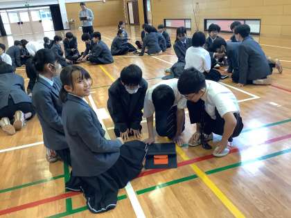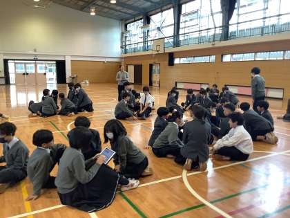 お昼休み、1年生は学年委員会主催の昼レクを行いました。班対抗のゲーム「ロング・ロング・ワード」で大いに盛り上がりました。