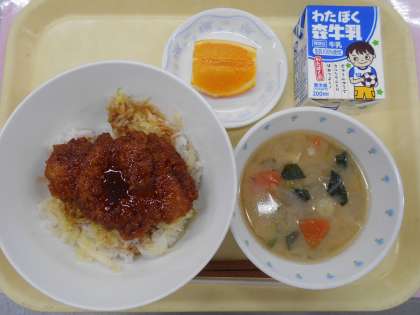 今日の主食は「ソースカツ丼」でした。明日、21日は都立高校一般入試日なので、3年生へのゲン担ぎとして、前日の今日は「ソースカツ丼」にしました。